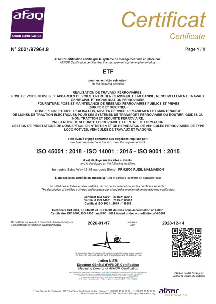 Zertifikate ISO 9001, ISO 14001, ISO 450011 MB Präqualifikationsnachweis für Bauleistungen an Infrastrukturanlagen des DB Konzerns, Oberbau, konventionell-Schotter546 KB Zertifikat Fachbetrieb gemäß Wasserhaushaltsgesetz1 MB Eignungsnachweis zum Einbau von Beton mit höherer Festigkeit und anderen besonderen Eigenschaften (Beton der Überwachungsklasse 2 und 3)452 KB Präqualifizierte Leistungsbereiche der Zertifizierung Bau620 KB Zulassung gem. VDV 609112 KB